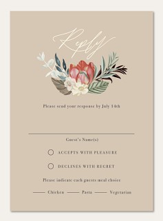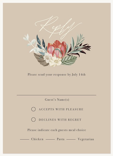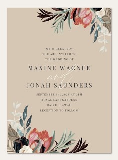 Set the tone for your elegant celebration with this romantic wedding invitation featuring artistically painted florals in coral and sage. The sophisticated serif typography is beautifully framed by watercolor blooms and delicate foliage against a warm beige background. Available on premium cardstock with your choice of luxurious finishes to perfectly capture your wedding day style.