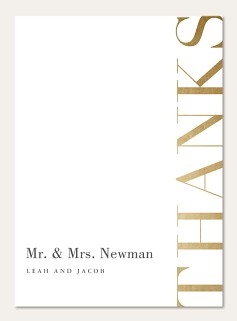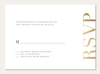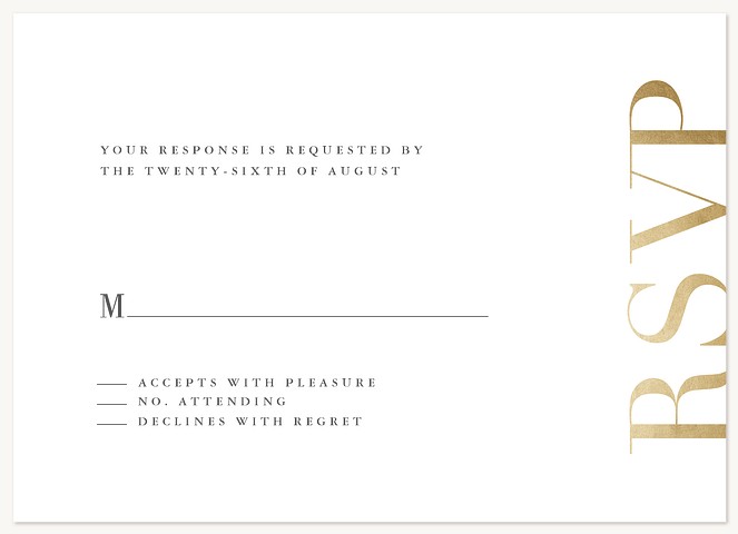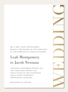Make a sophisticated statement with this contemporary wedding invitation featuring striking gold faux foil lettering and refined typography. The asymmetrical layout pairs minimalist black text with a dramatic faux metallic accent for modern elegance. Available on premium cardstock with multiple finish options to perfectly suit your celebration.