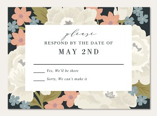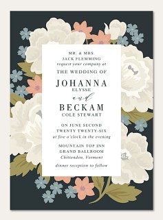 Frame your wedding details in timeless elegance with this sophisticated invitation featuring a lush botanical border of ivory roses and delicate coral blooms against a dramatic dark background. The classic typography creates an air of vintage romance, while premium paper options ensure your announcement makes a lasting impression.