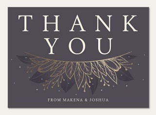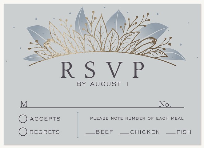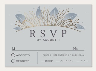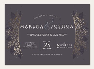 Transform your wedding invitation into an enchanted evening affair with this celestial-inspired design featuring shimmering gold faux foil botanicals against a dramatic charcoal background. The elegant typography and symmetrical leaf motifs create a sophisticated frame, while delicate starry details add a touch of magic. Available on premium cardstock with your choice of luxurious finishes.