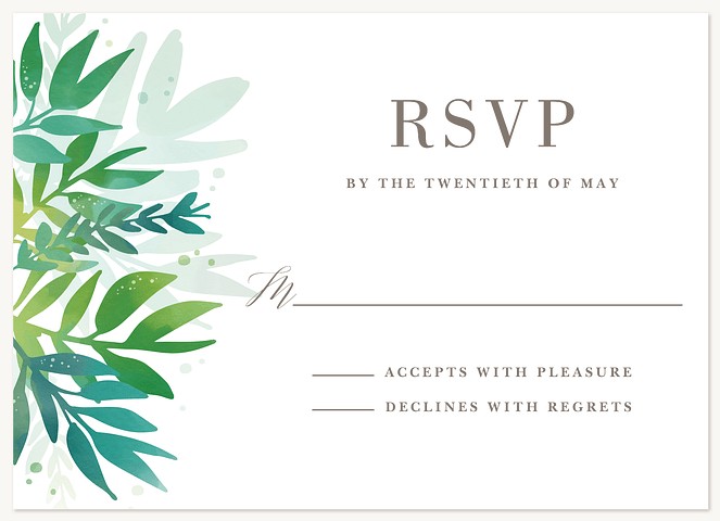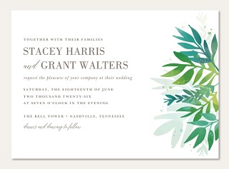 Embrace natural elegance with this sophisticated wedding invitation featuring graceful watercolor botanicals in fresh greens. The clean typography and minimalist layout create perfect harmony with the artistic foliage detail. Available on premium cardstock with customizable finishing options to perfectly capture your celebration's style.
