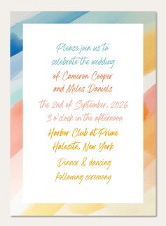 Make your wedding announcement as vibrant as your love story with this contemporary watercolor wedding invitation. Soft diagonal brushstrokes in dreamy pastels frame your celebration details, while modern script typography adds an artistic touch. Customize with your choice of premium papers and finishes to create an invitation that perfectly sets the tone for your special day.