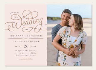 Make your wedding announcement as elegant as your love story with this sophisticated split-design invitation. Graceful copper-toned calligraphy sweeps across a soft blush background, perfectly balanced by a customizable photo space. This contemporary design, with premium paper options, ensures your special announcement feels as luxurious as it looks.