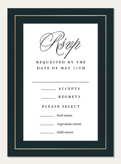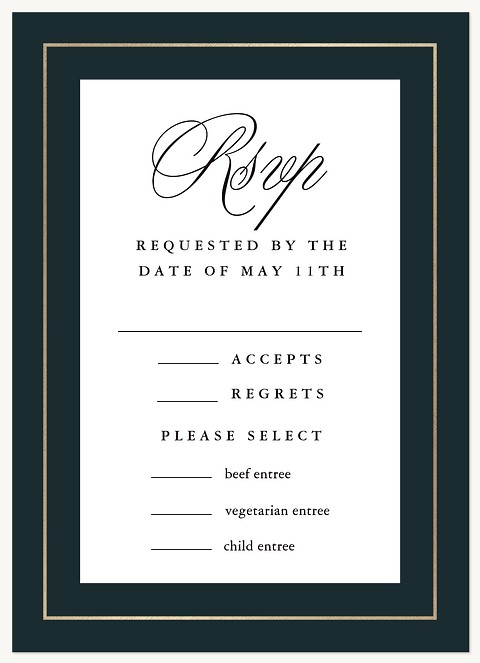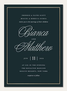 Make a sophisticated statement with this timelessly elegant wedding invitation featuring luxurious calligraphy against a rich forest green backdrop. The shimmering golden frame adds a touch of opulence while maintaining classic refinement. Available on premium cardstock with customizable finishing options to perfectly capture your wedding day elegance.