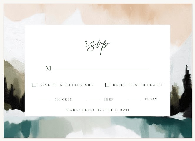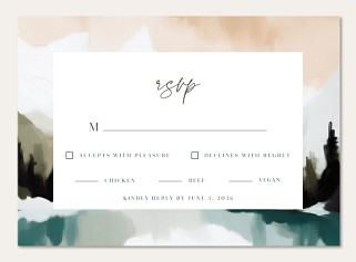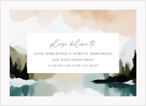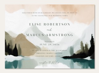 Transform your wedding announcement into an artistic vision with this contemporary watercolor invitation. Serene mountain landscapes in soft sage and teal tones frame your ceremony details with elegant serif typography and delicate script accents. Available on premium double-sided cardstock with choice of luxurious finishes.