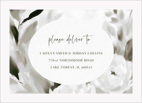 Frame your wedding day details with ethereal botanical artistry in this contemporary invitation design. Dramatic watercolor leaves in sophisticated grayscale create a floating garden effect around crisp serif typography. Perfectly balances modern minimalism with romantic natural elements for an unforgettable announcement of your celebration.