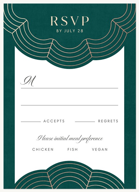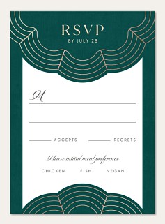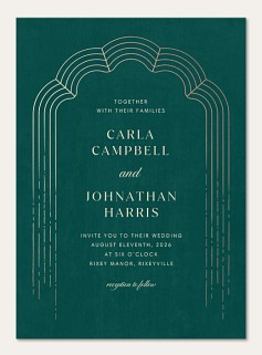 Make a grand entrance into wedded bliss with this stunning art deco wedding invitation. The shimmering gold archway frames your celebration details against a rich emerald backdrop, creating an atmosphere of timeless sophistication. Customize this elegant design with your choice of premium papers and finishes to set the perfect tone for your special day.