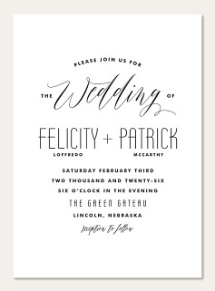 Make your wedding announcement as distinctive as your love story with this sophisticated wedding invitation featuring graceful script typography and clean modern details. The elegant monochrome design balances dramatic flourishes with precise geometric text, creating a timelessly refined aesthetic. Available on premium cardstock with luxurious finish options to perfectly set the tone for your celebration.