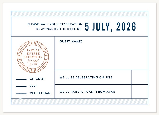 Embark on your wedding journey with this modern travel-inspired invitation design. Clean sans serif typography pairs with distinctive passport stamp motifs and monogram details in sophisticated navy and copper tones. The structured layout presents your celebration details with contemporary style while nodding to the adventure of marriage, available on premium cardstock with optional double-sided printing.