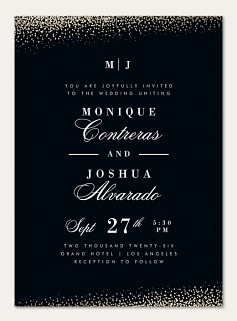 Make your wedding announcement as extraordinary as your love story with this sophisticated invitation design. Shimmering gold confetti cascades across a deep black background, while elegant serif typography and flourishing script create a timelessly romantic aesthetic. Customize every detail on premium cardstock with your choice of luxurious finishes to set the perfect tone for your celebration.