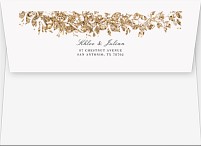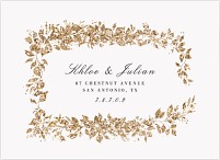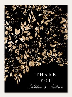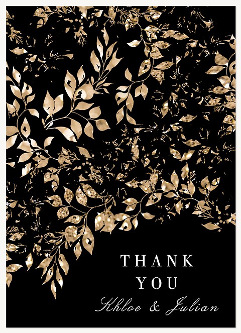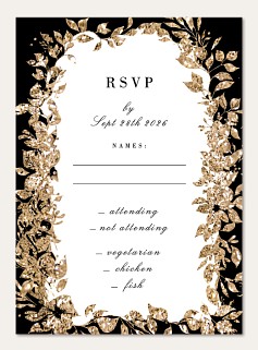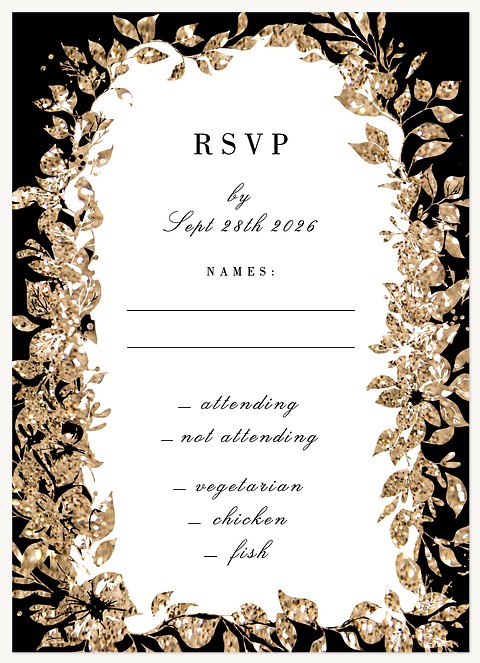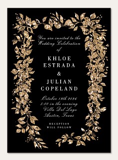 Make an unforgettable first impression with this dramatic wedding invitation featuring a luxurious faux metallic gold botanical frame against deep black. The sophisticated design combines elegant serif typography with flowing script, all beautifully framed by shimmering leaves and delicate sprigs. Available in premium paper options with customizable finishing touches.