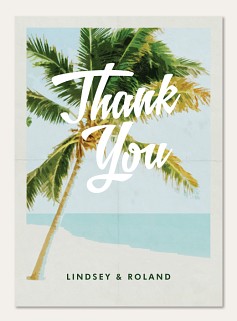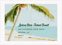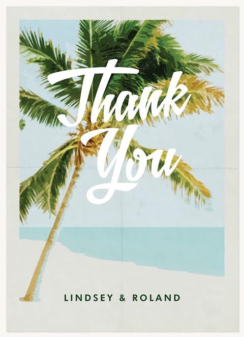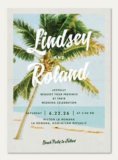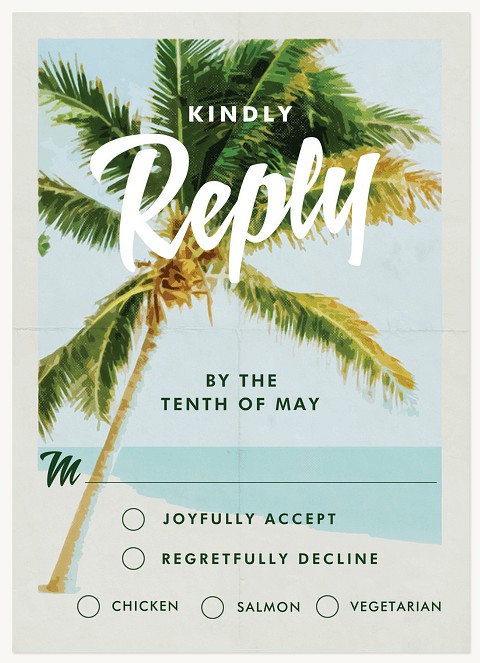 Transport guests to paradise with this vintage-inspired destination wedding invitation featuring a majestic palm tree illustration against a serene seafoam sky. The retro travel poster design combines flowing script with clean typography, creating an elegant balance that captures the romance of tropical destinations. Customize on premium cardstock with optional double-sided printing and choice of luxurious finishes.