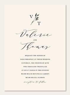 Elevate your wedding invitation with this elegant botanical design featuring a delicate leaf sprig and sophisticated typography. The refined combination of flowing script and classic serif fonts creates a timeless aesthetic. Available on premium cardstock with customizable finishing options.