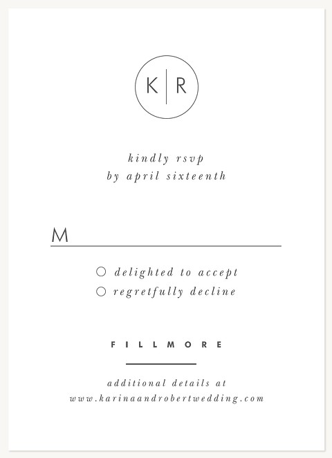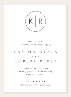 Make a sophisticated statement with this minimalist wedding invitation featuring a striking circular monogram emblem. The clean typography and balanced layout create an air of modern elegance. Available in premium paper options with customizable finishing touches.