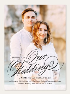 Transform your cherished photo into an elegant wedding invitation with this sophisticated full-bleed design. Dramatic calligraphic script and flourishes dance across the image, while refined serif typography adds timeless sophistication. Available on premium cardstock with optional double-sided printing and luxurious finish choices.