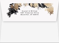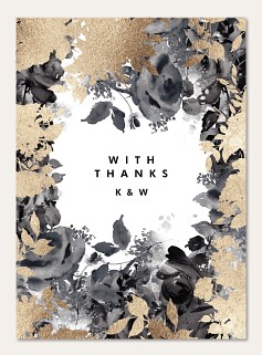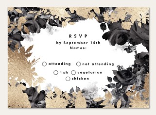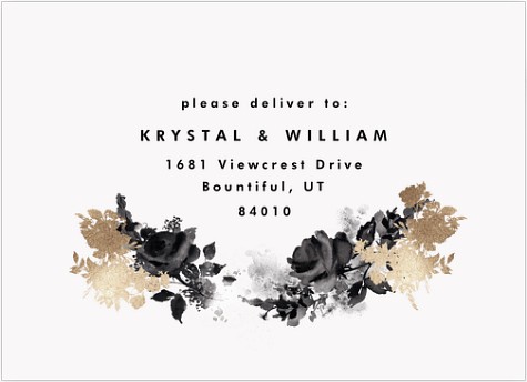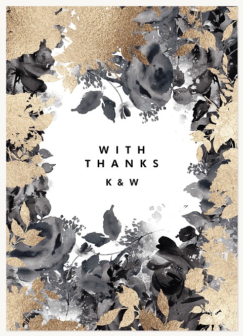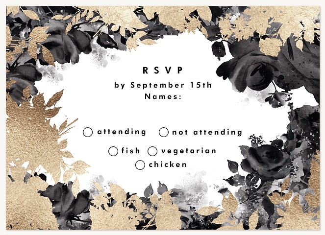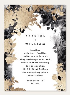 Make your wedding announcement unforgettable with this sophisticated invitation featuring dramatic black watercolor florals adorned with shimmering gold faux foil accents. The modern typography and asymmetrical botanical design create an artistically balanced composition that sets an elegant tone for your celebration. Available on premium cardstock with your choice of luxurious finishes.