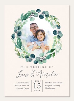 Frame your wedding celebration with a romantic eucalyptus wreath delicately painted in soft watercolor greens and teals. This elegant invitation features graceful script typography and classic serif details, perfectly balanced within a circular design. Available on premium cardstock with your choice of luxurious finishes to create an unforgettable announcement of your special day.