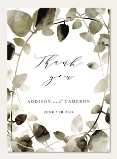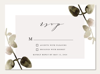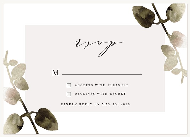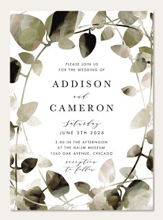 Frame your wedding celebration with this sophisticated botanical invitation featuring delicate watercolor leaves in soft sage and gray tones. The elegant serif typography and flowing script accents create a perfect balance of classical and contemporary style. Customize your details on premium cardstock with your choice of luxurious finish options.