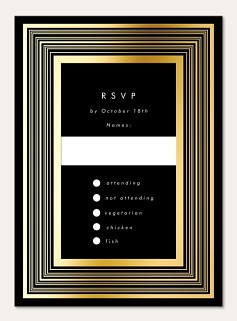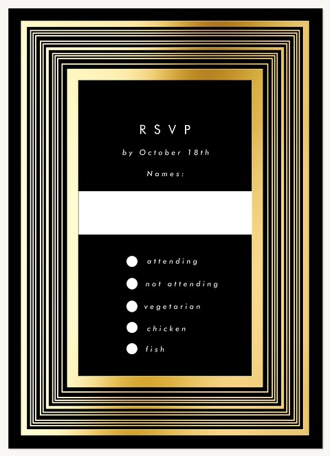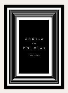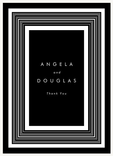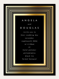 Make an unforgettable first impression with this striking wedding invitation featuring concentric metallic foil frames against a dramatic black background. The clean sans-serif typography and geometric border create a perfect balance of modern sophistication and timeless elegance. Expertly printed on velvet cardstock with raised foil detailing for a luxurious finishing touch.