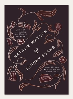 Transform your wedding invitation into an enchanting garden story with this sophisticated botanical design. Delicate tulip blooms and graceful vines in lustrous raised foil create an ethereal frame on luxurious velvet cardstock. The romantic composition perfectly sets the tone for your elegant celebration, with customizable foil colors adding a personal touch of magic.