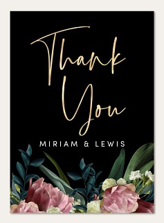 Make a sophisticated statement with this dramatic wedding invitation featuring a luxe black background adorned with romantic watercolor blooms. The striking combination of bold serif typography and delicate gold script creates an air of modern elegance, while lush pink roses and emerald foliage frame your wedding details beautifully. Available on premium cardstock with optional pearl shimmer finish for an extra touch of luxury.