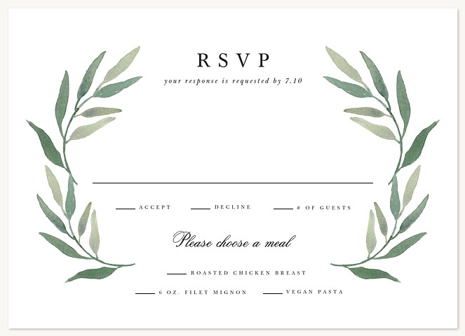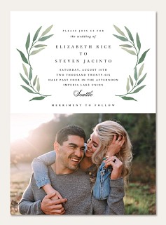 Frame your wedding details with graceful watercolor laurels in soft sage green tones. This sophisticated invitation features elegant typography, perfectly balanced with space for your favorite engagement photo. Available on premium cardstock with pearl shimmer finish for an extra touch of luxury.