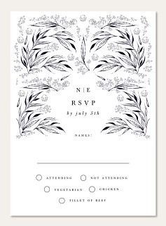 Elevate your wedding correspondence with this sophisticated RSVP card featuring an enchanting botanical frame of delicate leaves. The symmetrical design combines flowing calligraphic flourishes with crisp typography for timeless elegance. Available in premium paper options with customizable text and finishing touches.