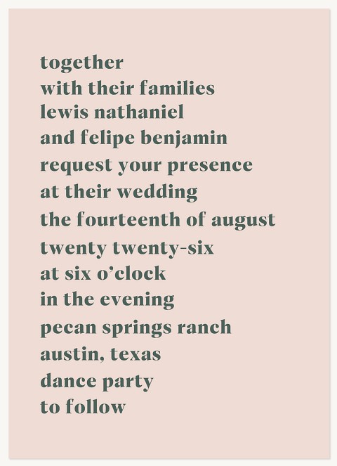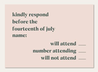 Elevate your wedding correspondence with this sophisticated RSVP card featuring bold serif typography in rich sage green. The minimalist design creates an effortless elegance through thoughtful spacing and clean layout. Customize with your choice of premium papers and finishes to perfectly complement your wedding suite.