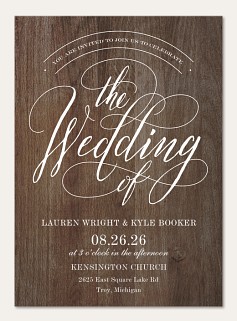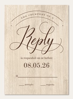 Blend timeless elegance with rustic charm in this beautifully crafted RSVP card. The sophisticated script typography flows gracefully across a weathered wood grain background, framed by delicate scalloped edges. Available in premium paper options with customizable response details to perfectly coordinate with your wedding suite.