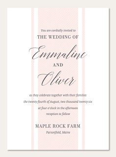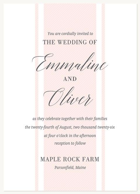 Elevate your wedding correspondence with this sophisticated RSVP card featuring delicate blush stripes and graceful script typography. The clean, minimalist layout with die-cut edges offers effortless elegance while making response collection simple and stylish. Available in premium paper options with customizable finishing touches to perfectly complement your wedding suite.