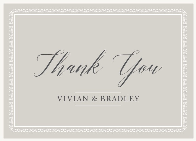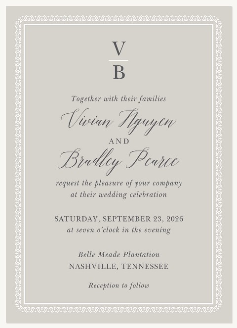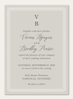 Elevate your wedding correspondence with this sophisticated RSVP card featuring an intricate lace-inspired border frame. The classic serif typography and refined gray palette create an air of timeless elegance, while the spacious layout ensures clear communication of guest responses. Available in premium paper options with customizable finishing touches.