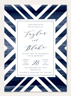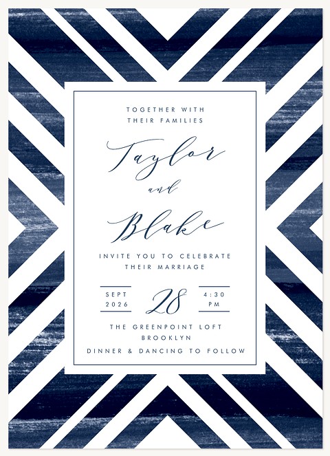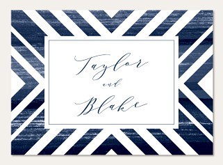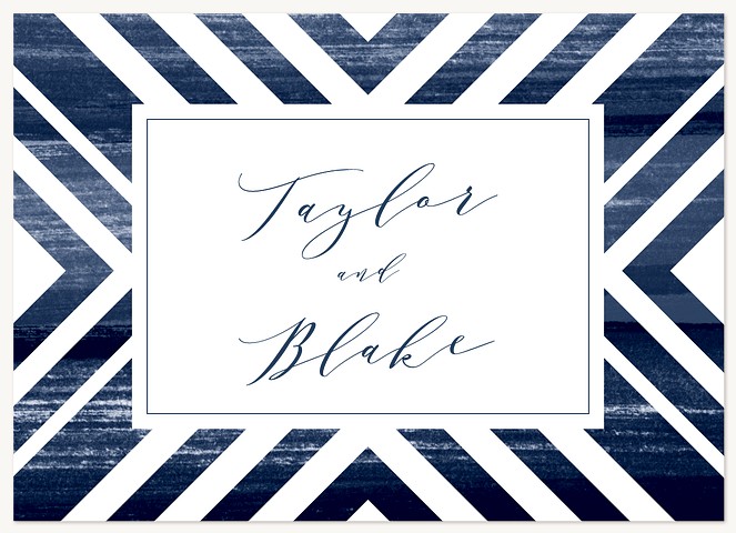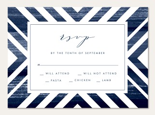 Make collecting wedding responses effortless with this sophisticated RSVP card featuring bold geometric navy stripes and modern calligraphy. The striking angular frame and clean layout guide guests to provide clear responses, while premium cardstock options ensure a luxurious presentation worthy of your celebration.