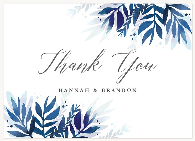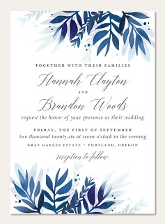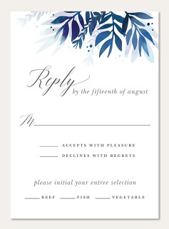 Elevate your wedding correspondence with this sophisticated RSVP card featuring cascading watercolor foliage in dreamy navy and powder blue hues. The elegant script typography and clean layout make responding effortless for your guests, while the premium paper options ensure a luxurious finishing touch.