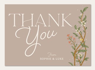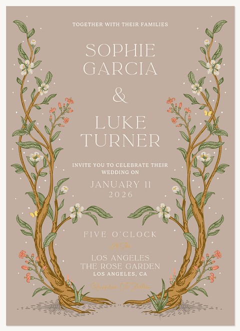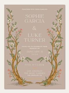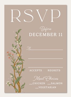 Elevate your wedding correspondence with this botanical RSVP card featuring an elegant climbing vine illustration in soft coral and green. The sophisticated serif typography and structured layout create a perfect balance of natural beauty and formal organization. Customize with your choice of premium papers and finishes to complement your wedding suite.
