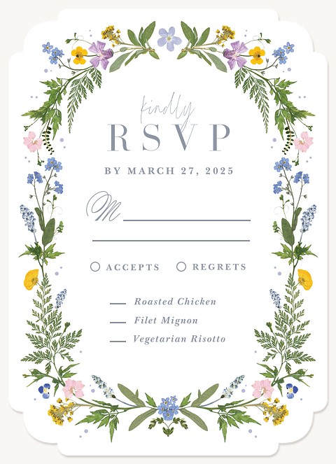 Capture the romance of a garden wedding with this enchanting RSVP card adorned with delicate wildflowers and sage foliage. The elegant serif typography and graceful script accents create a timeless aesthetic, while the scalloped edges add a refined finishing touch. Available on premium cardstock with your choice of luxurious finishes.