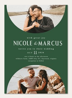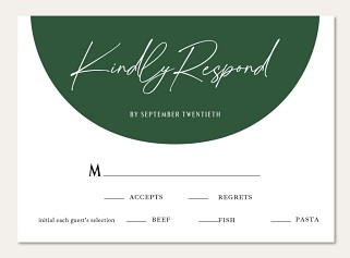 Create a sophisticated response system with these modern minimalist wedding RSVP cards featuring an elegant arch design. The striking forest green backdrop pairs beautifully with flowing white script typography and clean organizational elements including response checkboxes and meal selection lines. This thoughtfully designed layout makes it effortless for guests to confirm their attendance while adding contemporary elegance to your wedding stationery suite.