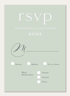 Streamline your wedding planning with this beautifully designed RSVP card that combines functionality with timeless style. The design features a soft sage green background with clean sans-serif typography and an elegant script signature line, creating a sophisticated yet approachable aesthetic. This thoughtfully organized layout makes it easy for guests to respond while adding a polished touch to your wedding stationery suite. Customize colors to match your wedding theme and choose from premium cardstock options with various finish choices.