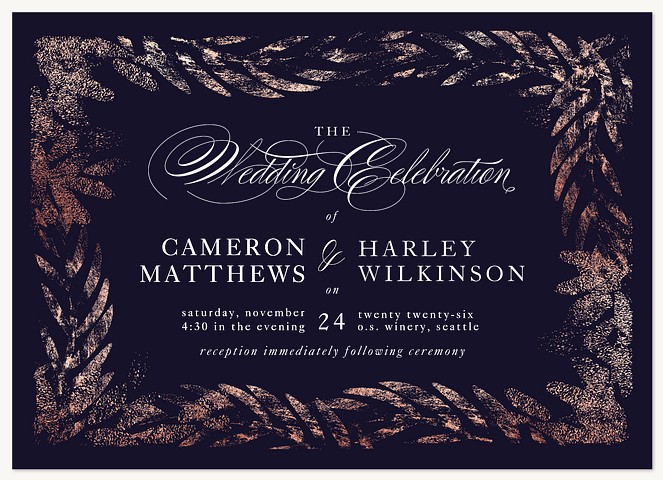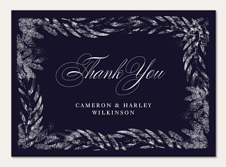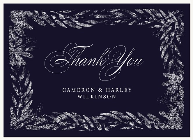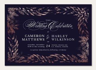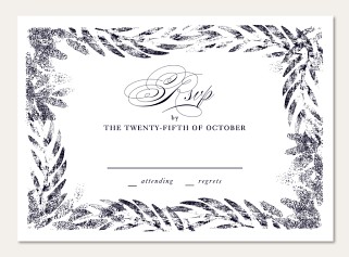 Bring timeless elegance to your wedding correspondence with this botanical RSVP card featuring delicate imprinted foliage and sophisticated script typography. The classic black-and-white design showcases a graceful leaf border with scalloped edges, creating an heirloom-worthy response card. Choose from premium paper options and finishing touches to perfectly complement your wedding suite.