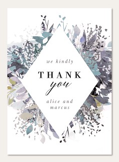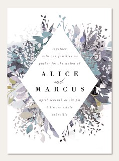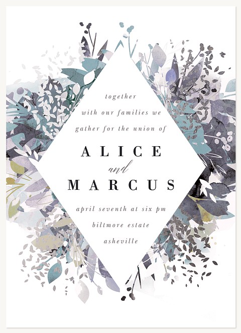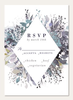 Capture your wedding style with this sophisticated RSVP card featuring a striking diamond frame surrounded by ethereal watercolor botanicals in serene blues and grays. The artistic floral design creates an elegant backdrop for collecting guest responses, while premium paper options ensure a luxurious presentation.