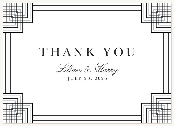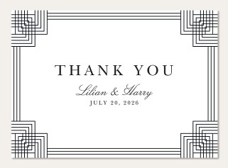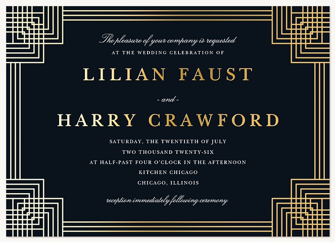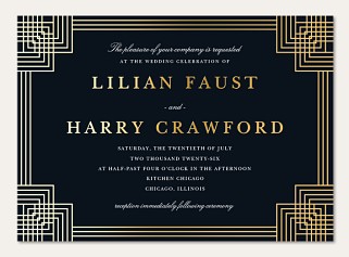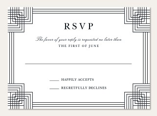 Channel the sophistication of the Art Deco era with this striking RSVP card. Geometric corner frames in precise linear patterns create an architectural border, while elegant typography balances modern clarity with timeless grace. Available in premium paper options with your choice of luxurious finishes to perfectly complement your wedding suite.