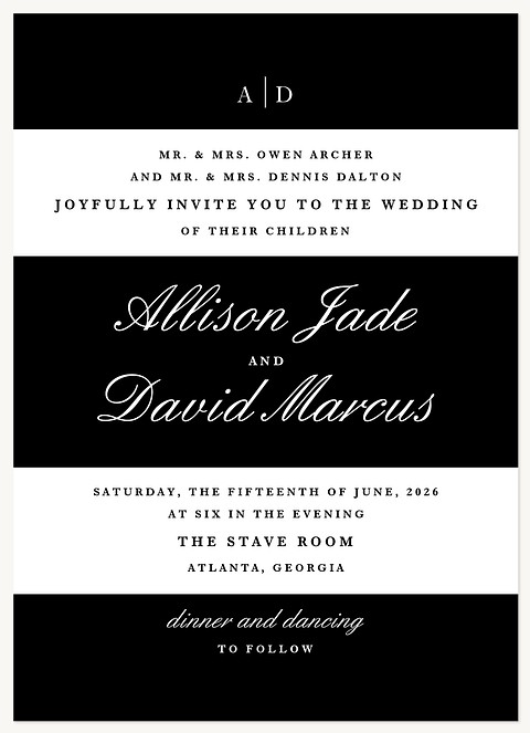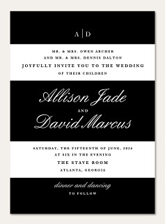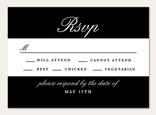Make collecting wedding responses effortless with this sophisticated RSVP card. Bold black and white stripes frame elegant script typography, creating a timeless monochrome design that coordinates beautifully with formal wedding suites. Available in premium cardstock options with your choice of luxurious finishes.
