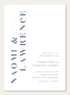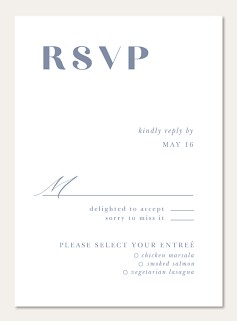 Make collecting wedding responses effortless with this sophisticated RSVP card featuring bold vertical typography and refined serif details. The clean, contemporary layout in soft blue-gray presents a perfect balance of modern style and timeless elegance. Available in premium paper options with customizable response sections.
