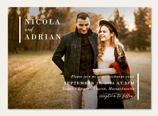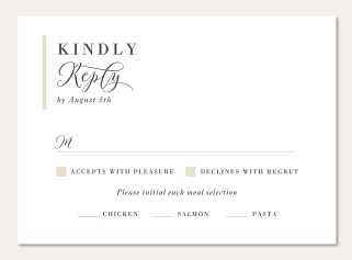 Elevate your wedding correspondence with this sophisticated RSVP card featuring an artful blend of serif and script typography. The refined layout pairs a vertical accent bar with elegant type treatments, while the structured response and meal selection areas ensure clear guest responses. Available on premium cardstock with multiple finish options to perfectly complement your wedding suite.