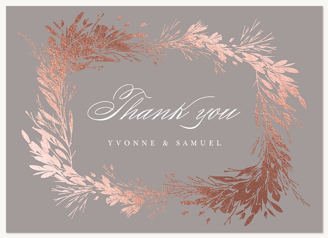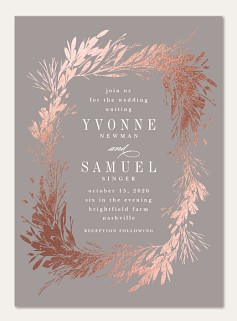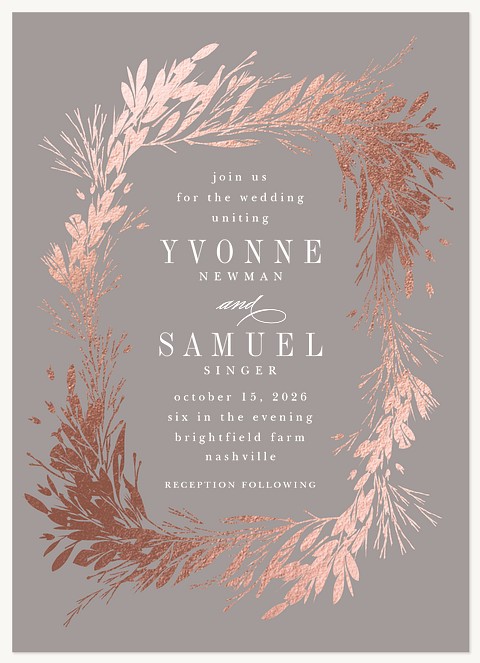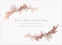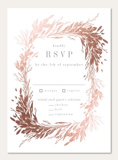 Elevate your wedding correspondence with this sophisticated RSVP card featuring a luminous rose gold botanical wreath. Delicate pine needles and graceful branches create an elegant frame, while classic serif typography adds timeless refinement. Available on premium cardstock with luxurious finish options to perfectly complement your wedding suite.
