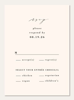 Merge modern elegance with practical planning through this minimalist RSVP card featuring graceful calligraphy and clean serif typography. The structured layout with geometric details makes collecting guest responses effortless while maintaining sophisticated style. Customize with your choice of premium papers and finishing options.