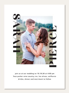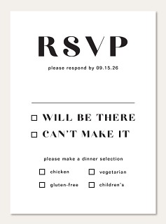 Make collecting RSVPs effortless with this striking contemporary response card. The bold typography and minimalist black-and-white design create a sophisticated statement, while the clean layout ensures guest responses are crystal clear. Available on premium cardstock with custom finish options.