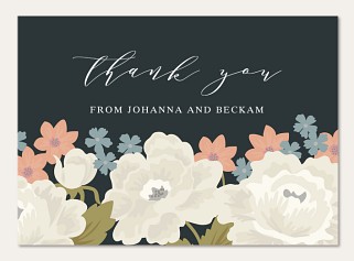 Express heartfelt gratitude with this sophisticated thank you card featuring luxurious white and coral blooms against a rich charcoal background. The elegant script typography and delicate botanical border create a timeless vintage appeal. Customize your message on premium cardstock with choice of pearl shimmer, matte, or glossy finish.