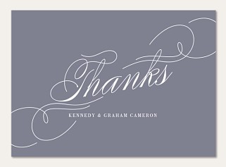 Express heartfelt gratitude with this sophisticated thank you card featuring dramatic calligraphy and graceful flourishes. The striking monochromatic design pairs elegant white script with a refined gray background. Printed on premium cardstock with your choice of luxurious finishes.
